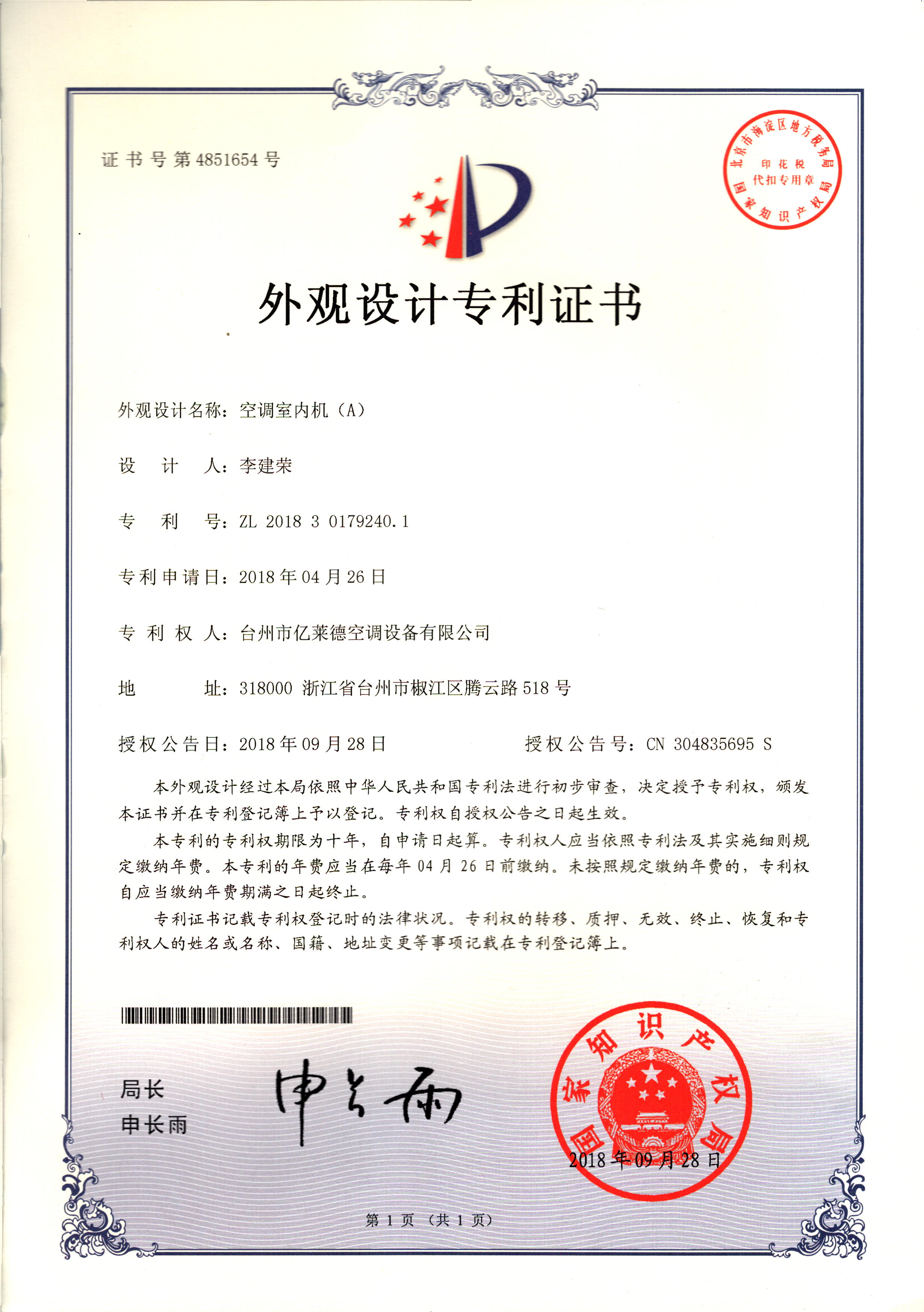 外觀設(shè)計專利證書--空調(diào)室內(nèi)機(jī)(A...
