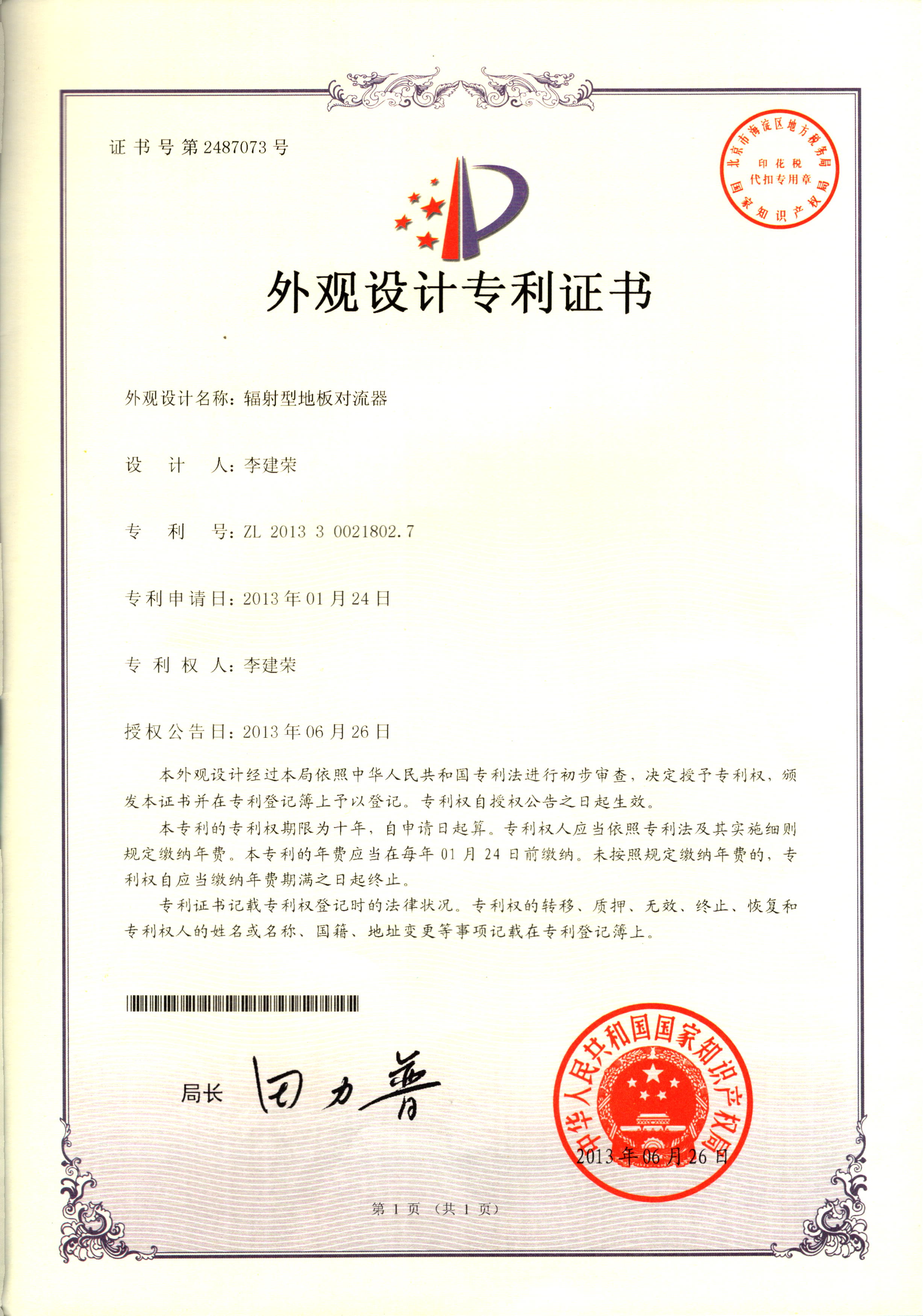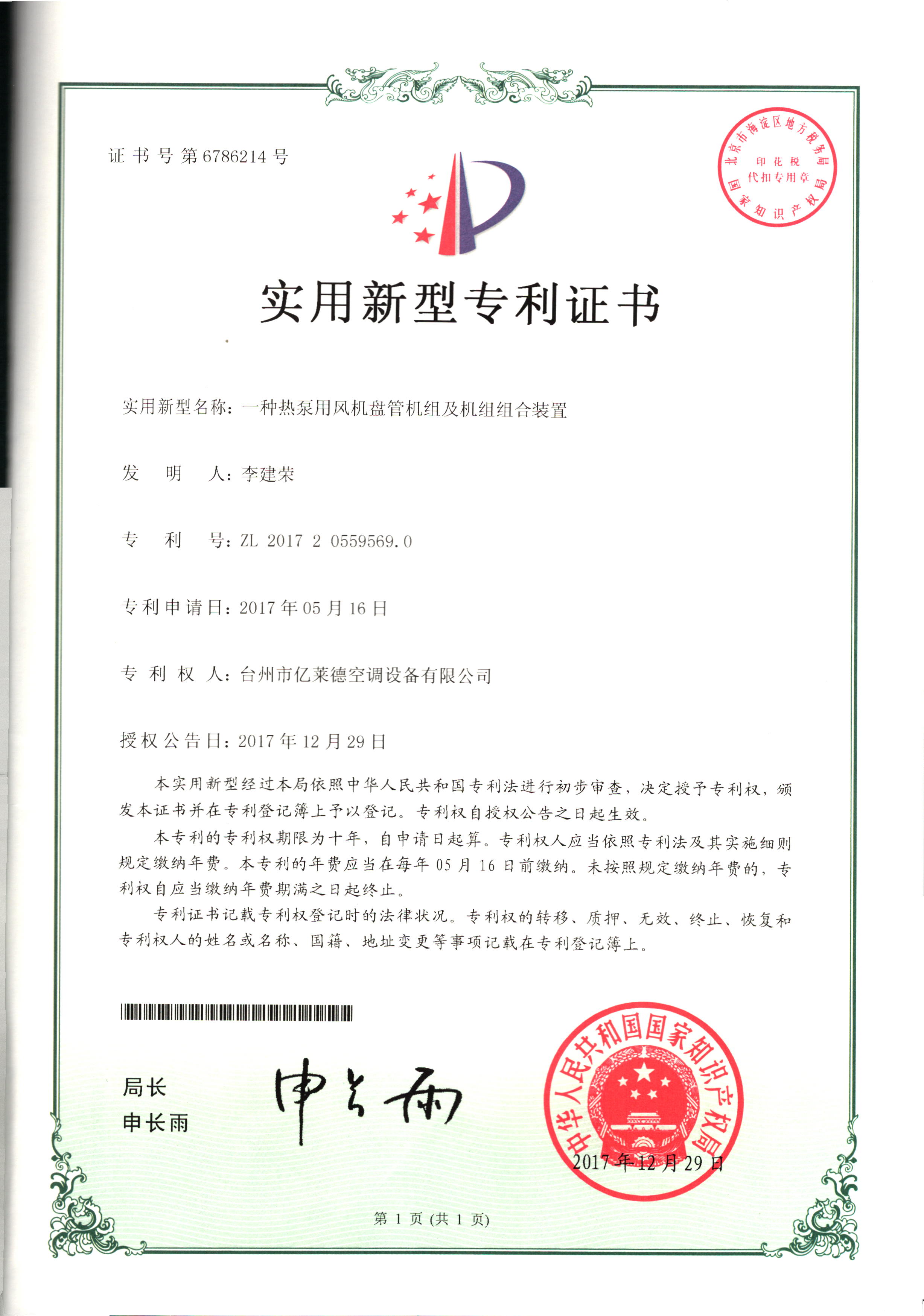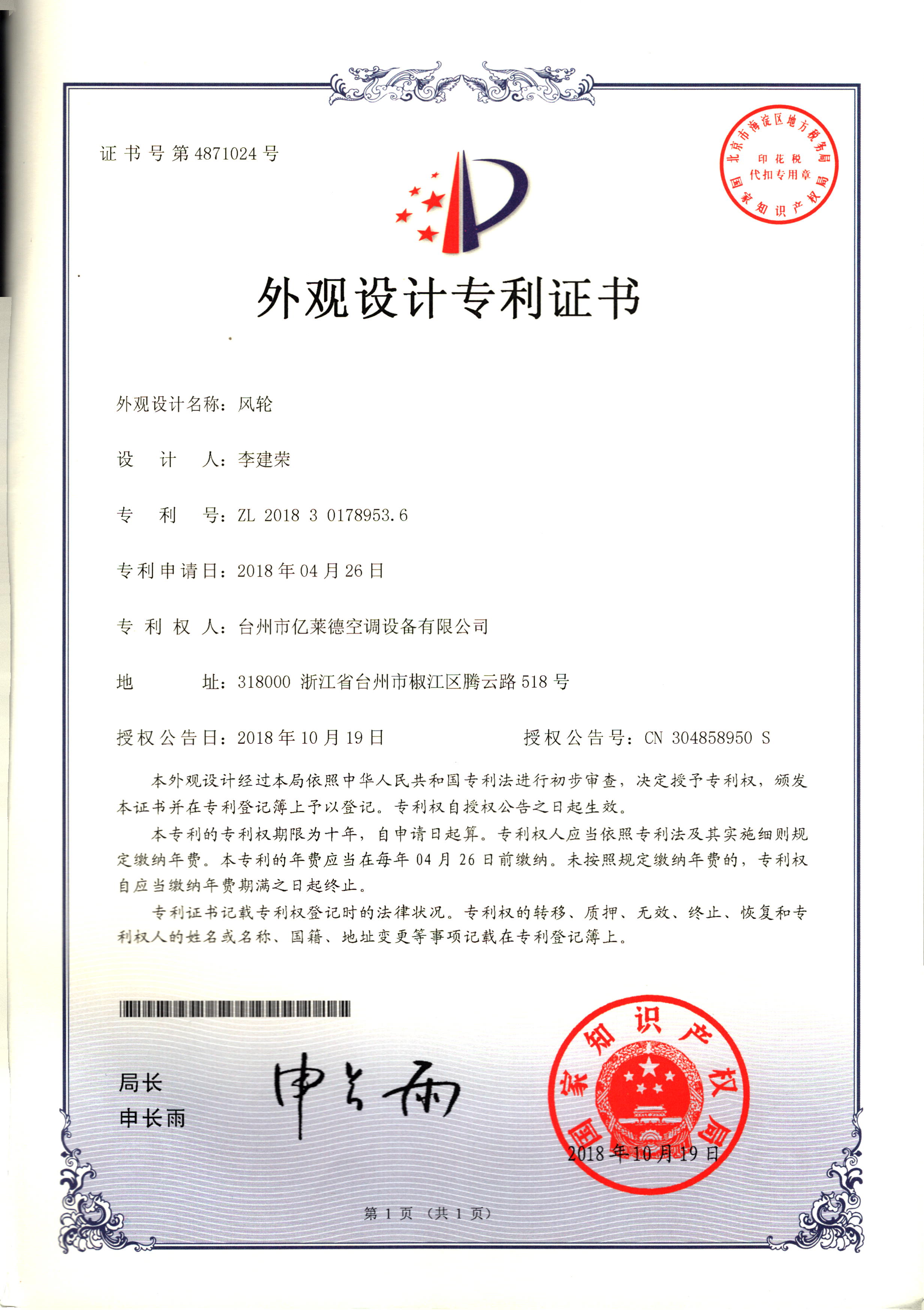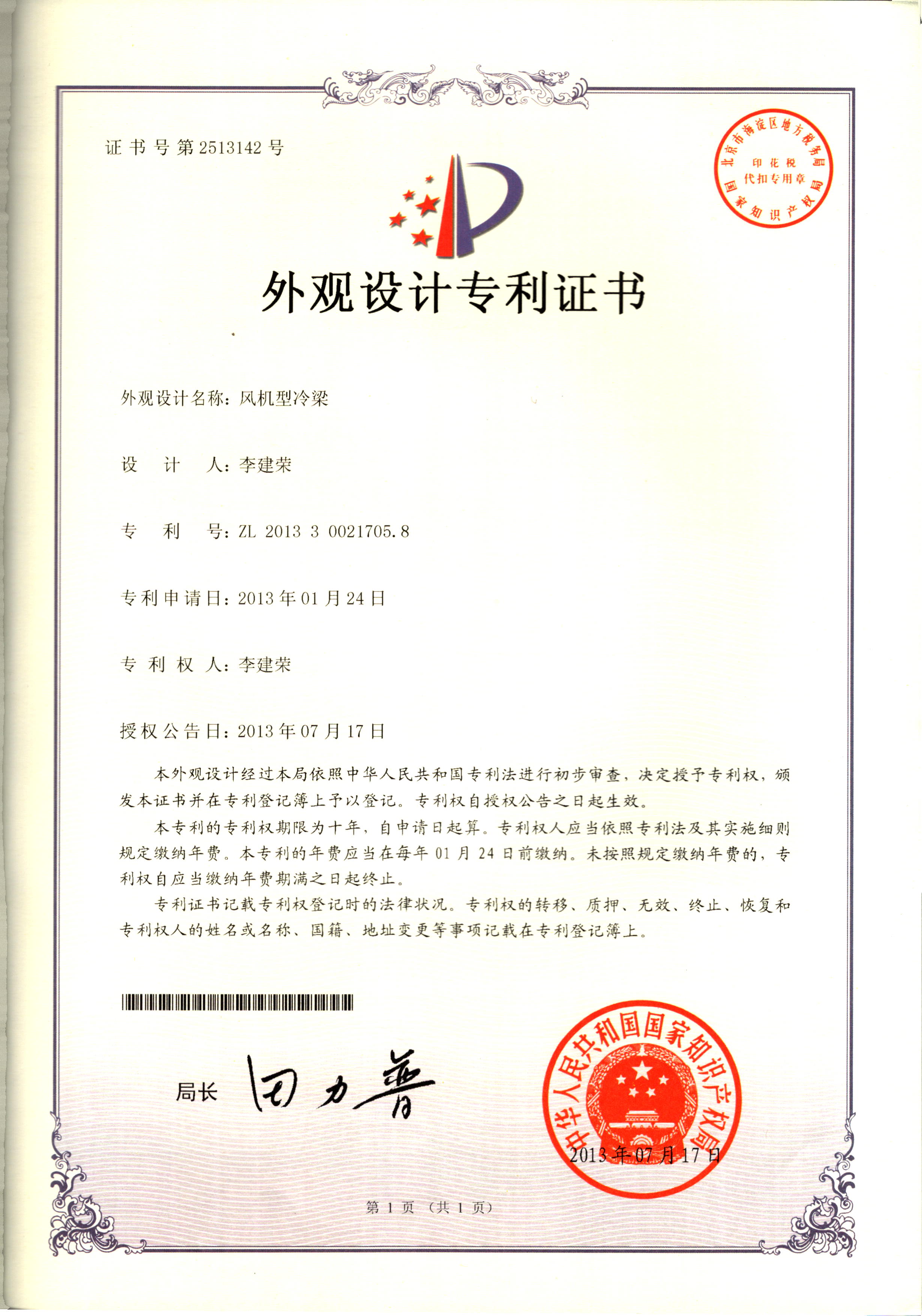 外觀設(shè)計專利證書--風(fēng)機(jī)型冷梁
