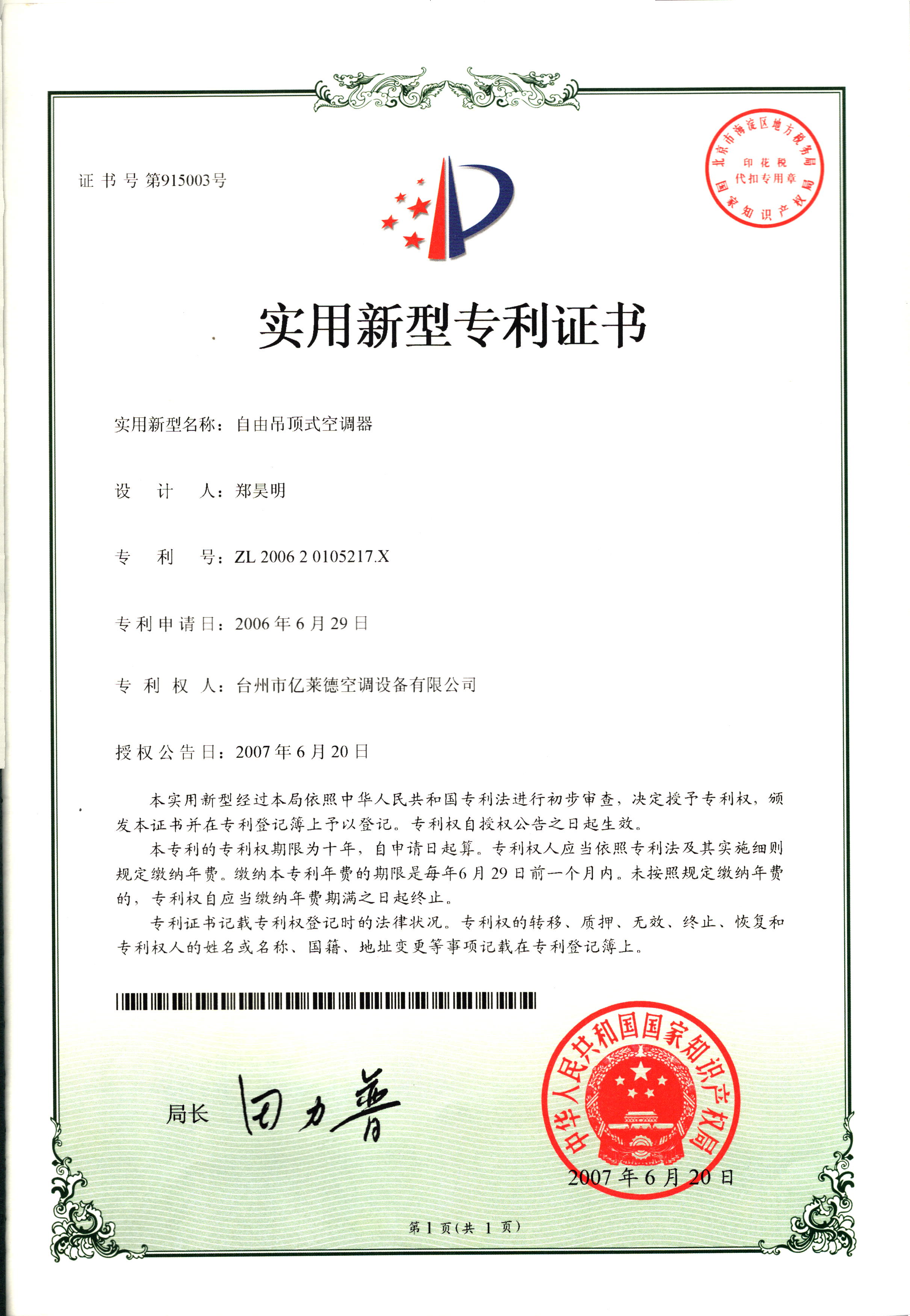 外觀設(shè)計專利證書--空調(diào)殼體(自由...